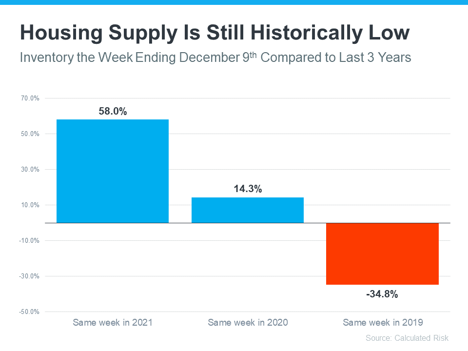 An article from Calculated Risk helps put the inventory gains the market has seen in 2022 into perspective by comparing it to recent years (see graph below). It shows supply has surpassed 2021 levels by 58%. But the further back you look, the more youll understand the bigger picture. And if you go all the way back to 2019, the last normal year in real estate, were roughly 35% below the housing supply we had at that time.