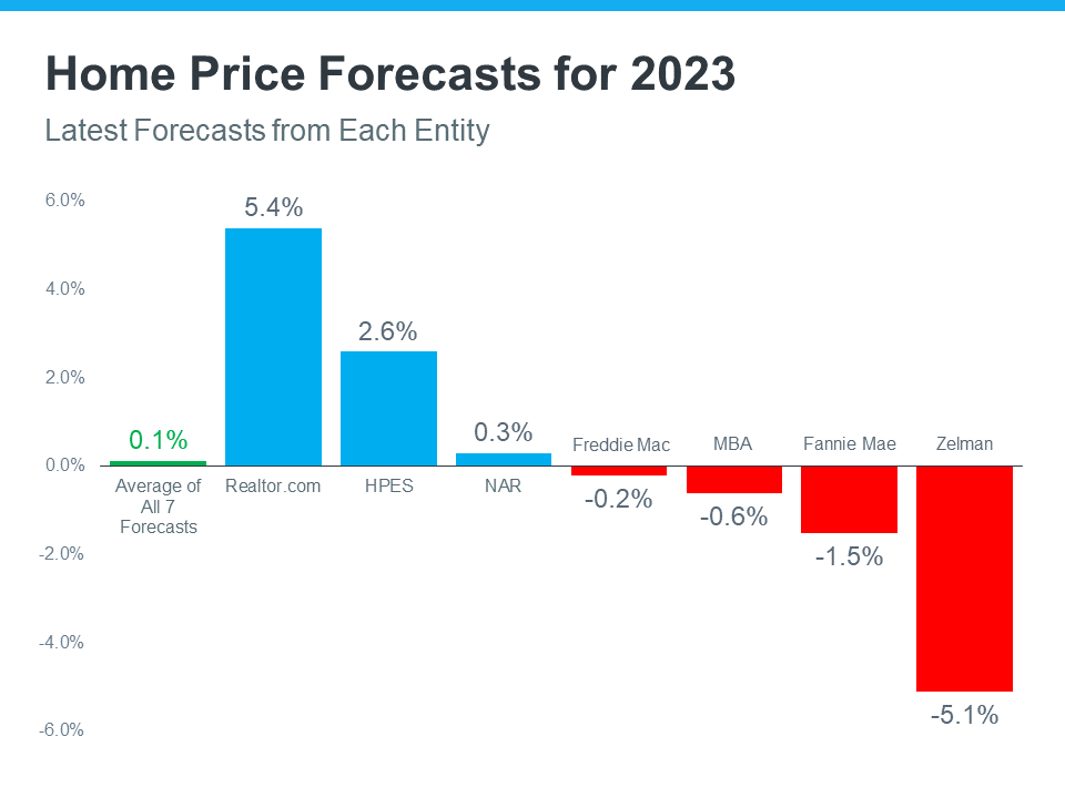 The graph below shows the latest home price forecasts for 2023. As the different colored bars indicate, some experts are saying home prices will appreciate next year, and others are saying home prices will come down. But again, if we take the average of all the forecasts (shown in green), we can get a feel for what 2023 may hold.