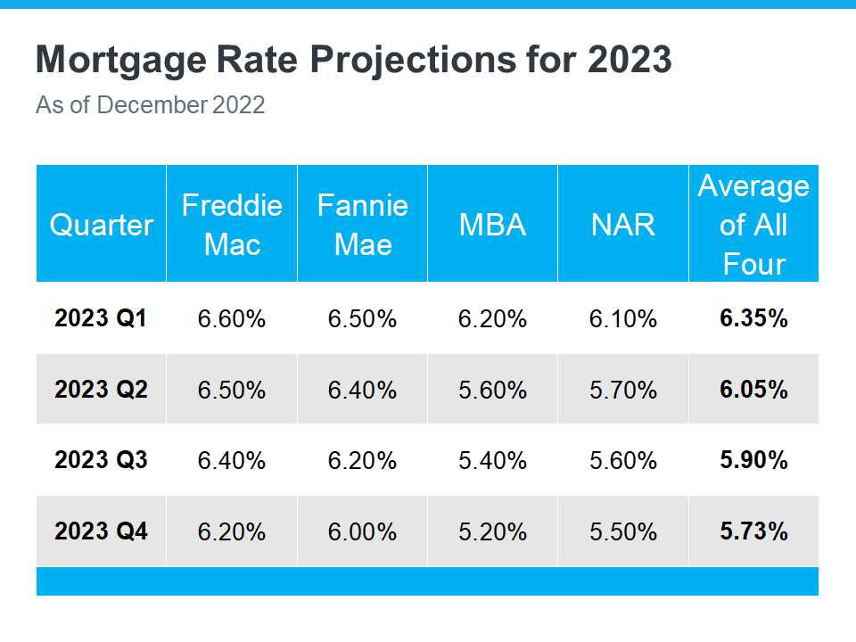 Right now, experts are factoring all of this into their mortgage rate forecasts for next year. And if we average those forecasts together, experts say we can expect rates to stabilize a bit more in 2023. Whether thats between 5.5% and 6.5%, its hard for experts to say exactly where theyll land. But based on the average of their projections, a more predictable rate is likely ahead (see chart below):